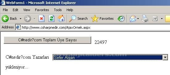 Bu noktada Ajax temelli yaklaşımı hissedebilmeniz açısından sizler için basit bir test uygulaması geliştirdim. Aşağıdaki örnek web sayfasında "C#nedir?com Toplam Üye Sayısı" isimli butona bastığınızda sayfa yeniden yüklenmeden ve posback işlemi olmadan sunucuya istek gönderilmekte, isteğin sunucudan başarıl bir şekilde geldiği XMLHttpRequest bileşeni ile anlaşıldıktan sonra basit bir Javascript yardımı ile sonuç bir label kontrolüne yazdırılmaktadır. Üstelik butonun tıklandığı an ile cevabın geldiği süre zarfında kullanıcıya "yükleniyor" hisse verilerek şık bir tasarım yapmış oluyoruz. Yine aynı şekilde C#nedir?com yazarlarının bulunduğu bir comboboxtan bir yazar seçildiğinde sunucuya istek gönderiliyor ve arka planda seçilen yazarın makaleleri veritabanından alınıp yine sayfa refresh(yenilenmeden) yada postback olmadan kullanıcıya gösteriliyor. Tabiki sonuç sayfaya geldiği anda sonuçların ekrana yazılması için basit Javascirpt komutları kullanılmaktadır.
